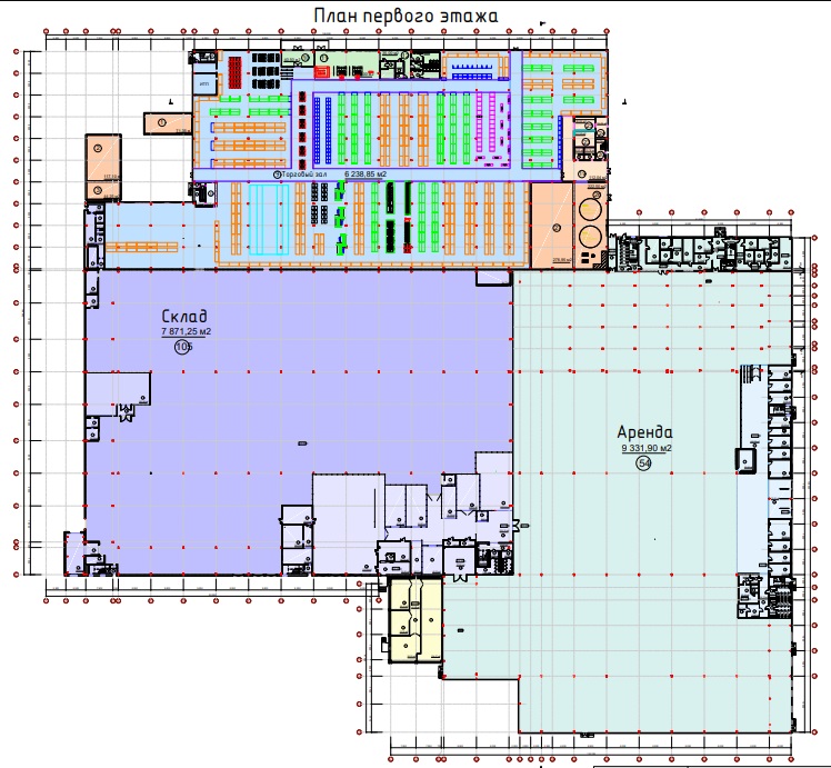 Объект включает в себя: торговый зал, склад, центр выдачи заказов, кассовая зона, комнаты для переговоров, офисы, раздевалки, мастерскую, помещения под аренду